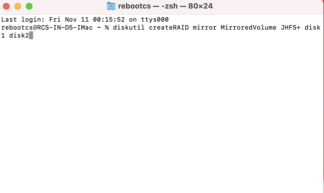 diskutil createRAID mirror MirroredVolume JHFS+ disk1 disk2