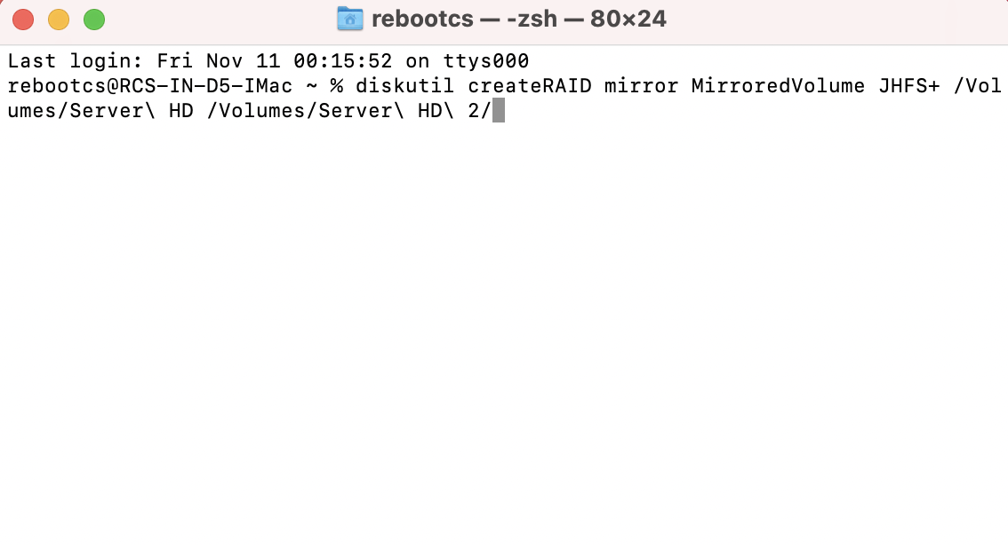 diskutil createRAID mirror MirroredVolume JHFS+ /Volumes/Server\ HD /Volumes/Server\ HD\ 2/
