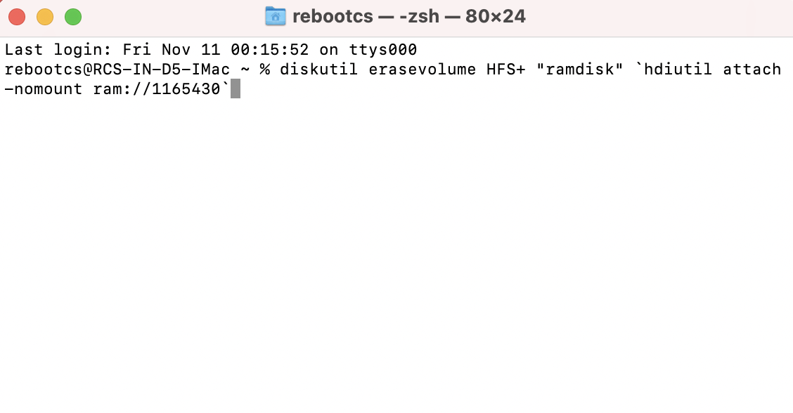 diskutil erasevolume HFS+ "ramdisk" `hdiutil attach -nomount ram://1165430`