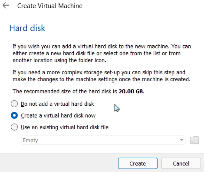 4. Choose “Create a virtual hard disk now,” and click on the “Create” button.