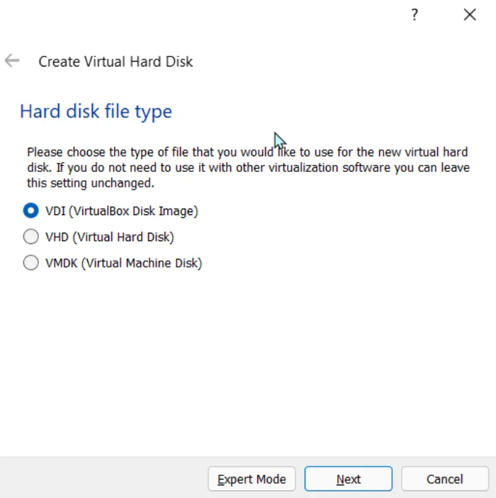 5. Leave the default setting of “VDI” checked and click “Next.”