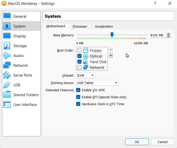 1. With your virtual machine highlighted, click on the “Settings” cog. Select “System” from the side menu and make sure that “Floppy” is unchecked in the “Boot Order” settings. This will ensure that your virtual machine boots from your Monterey disc image. Make sure you set “Base Memory” to a suitable level – 2048MB at a minimum.