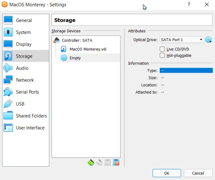 3. Select the “Storage” menu from the sidebar. Under Storage Devices, click on “Empty.” Click on the icon of an optical disk in the top-right corner of the screen, and select your Monterey ISO file, ensuring that “Use Host I/O cache” is enabled. Click “OK” to save the changes.