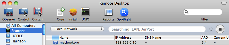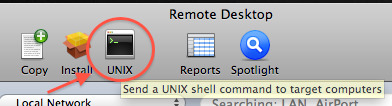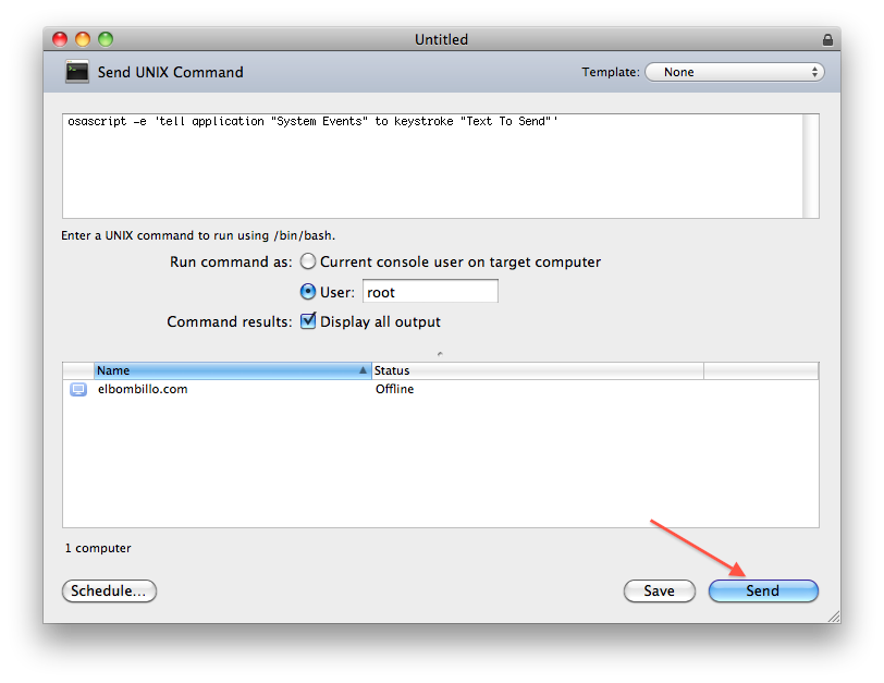 First Open the Remote Desktop application located in /Application/Remote Desktop. Next select the computer you want to send the keystrokes to.