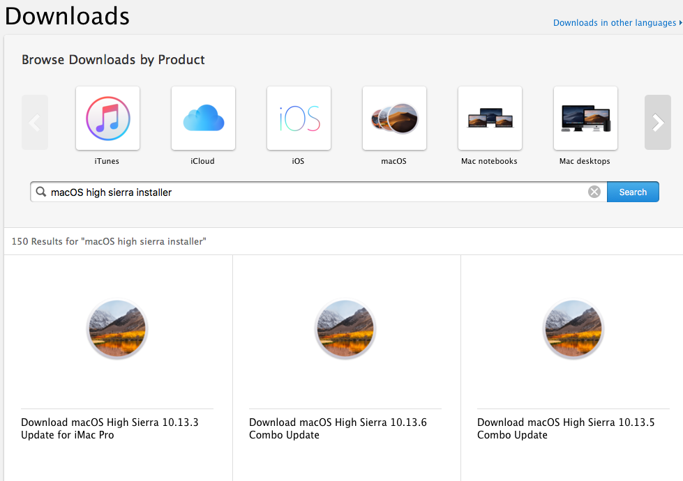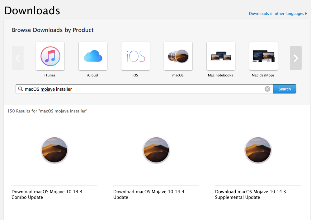 Let’s say you want to download the full macOS installer.app from Apple so you can deploy in-place upgrades or build a USB Installer. Let’s first check Support.Apple.com/Downloads.