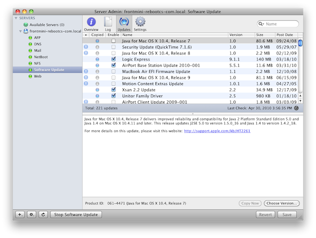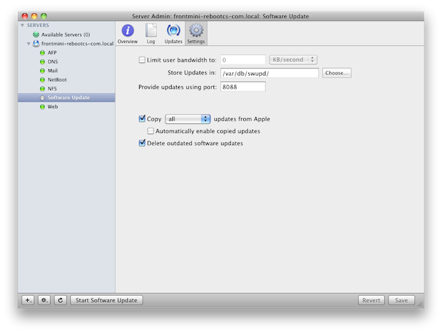 Problem: You have 10 software update servers that you only allow certains updates to be download by the clients. If you setup all the server individually, every time a new update comes out it will downloaded from Apple's master Software Update Server and you will have to enable that update on all 10 servers. Here is how you can have 1 internal master and other slave servers in a way that if you enable update on the Master and all the slave servers will mirror that.