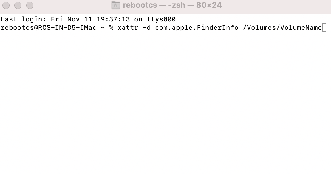 xattr -d com.apple.FinderInfo /Volumes/VolumeName